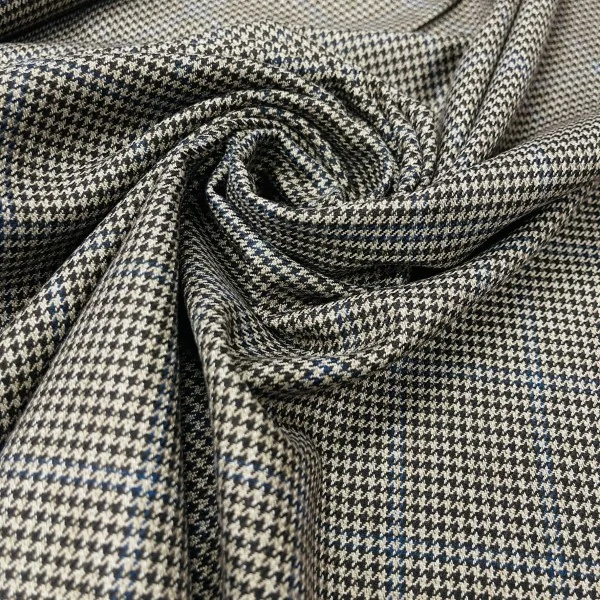 žąsies kojelės kostiuminis audinys su vos matomais mėlynais kvadratais. Gerai priglunda prie kūno, standus, neglamžus.